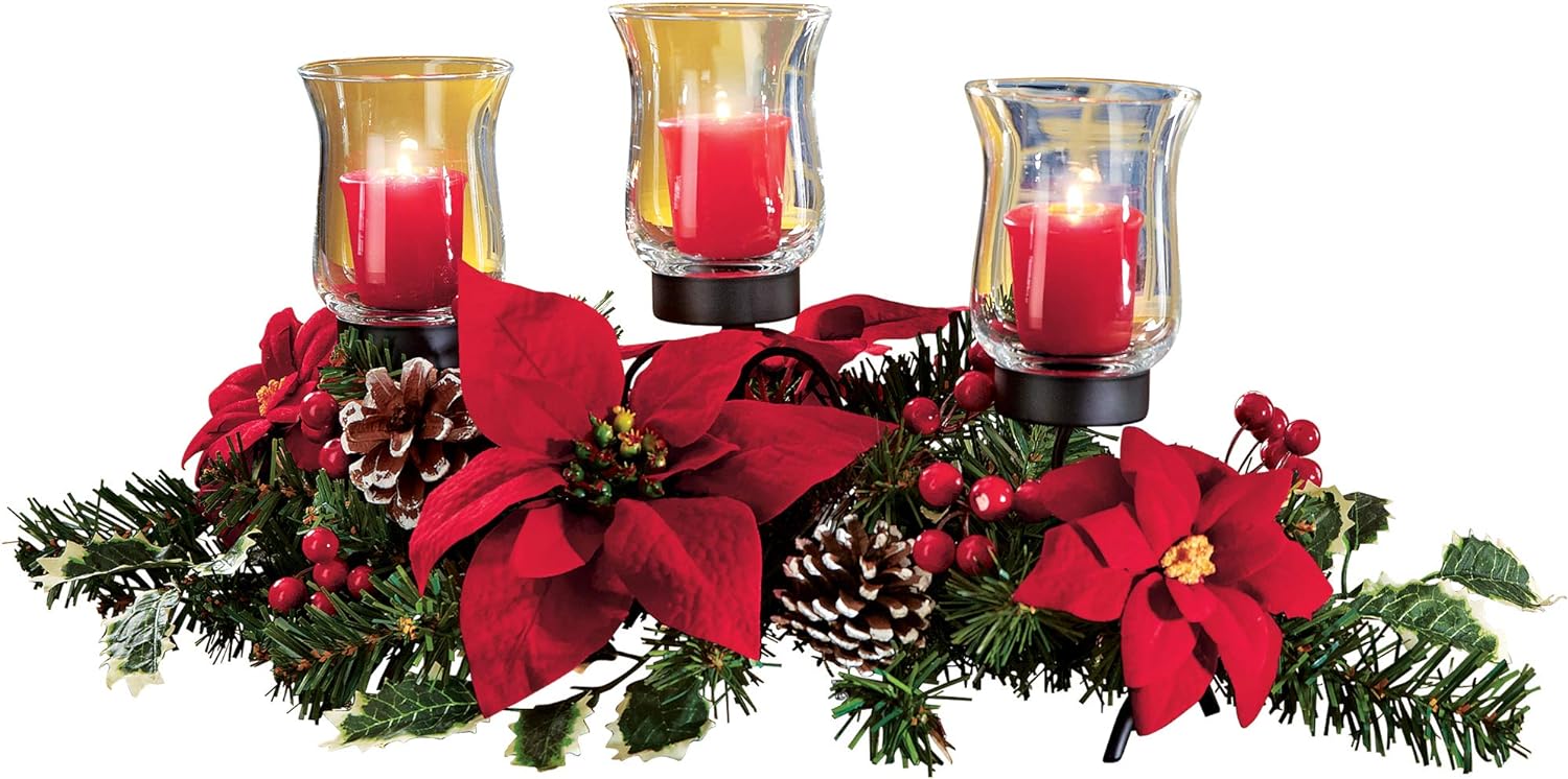 Collections Etc Christmas Poinsettia Candle Holder Centerpiece with Pinecones, Red 20″ L x 9″ W x 9 1/4″ H
