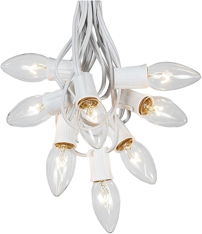 Set of 50 Warm White (soft white) LED bulbs on 25 feet of brown 22-gauge wire. The 5mm bulbs are spaced 6 inches apart, and there is a 6-inch lead and 6 inch tail. These sets are connectable end to end with a maximum of 43 strings connected on a single plug (1075 feet total). 4.8 Watts (0.04 Amps) Per Set. Stackable Fused Plug With 2 Extra 3 Amp Fuses