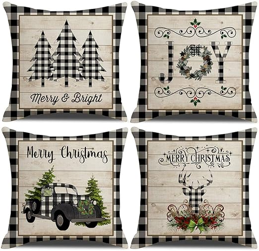 Ogrmar 4PCS 18″x18″ Throw Pillow Covers Christmas Decorative Couch Pillow Cases Cotton Linen Pillow Square Cushion Cover for Sofa, Couch, Bed (Red and Beige)